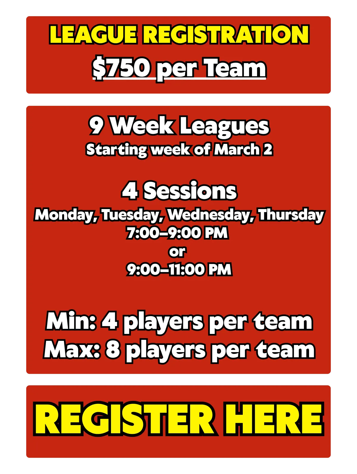 Leagues will be played on Mondays, Tuesday's, Wednesday's or Thursday's from 7:00–9:00 PM or 9:00–11:00